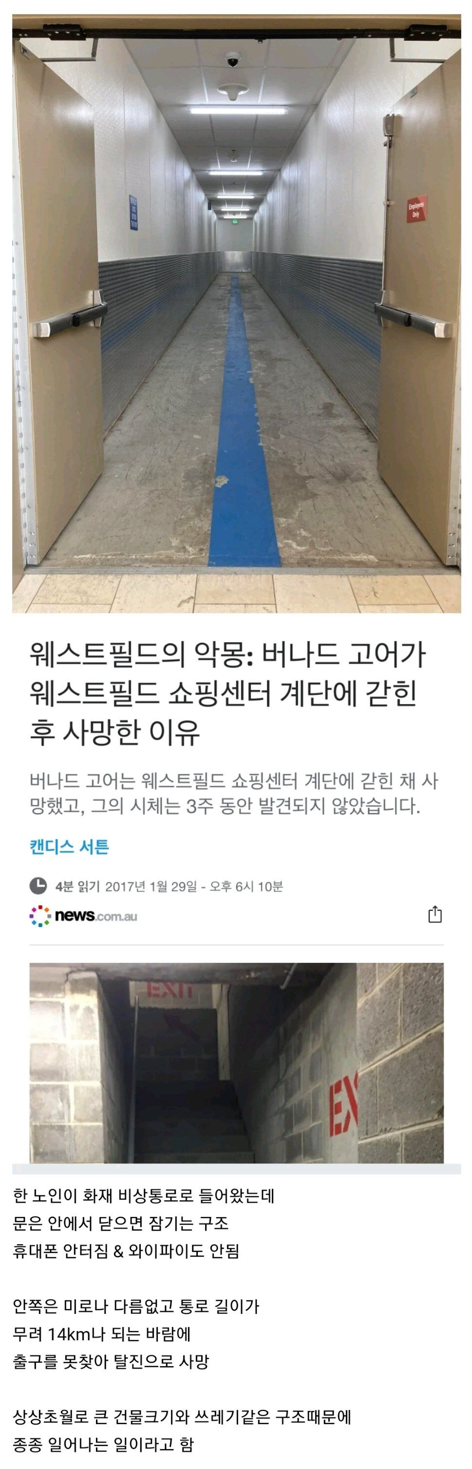 https://www.news.com.au/lifestyle/real-life/nightmare-in-westfield-how-bernard-gore-died-after-being-trapped-in-westfield-shopping-centre-stairwell/news-story/d06bc0b1917e88059015eab73e9c2867 14키로 넘는다는 뭐 그런 내용이 없는데 걍 실화기반 뉴스로 소설쓴듯