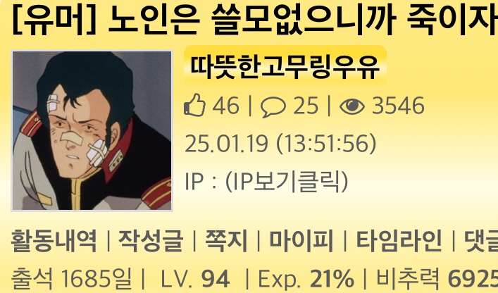 가진게 나이 어린거 밖에 없어서기도 할걸? 자기도 나이 먹으면 자기가 욕하던 노인이 된단걸 모르는 능지는 덤. | 25.01.19 17:23 | | |