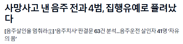 음주운전은 살인죄와 동등한 처벌이 내려져야한다고 생각.