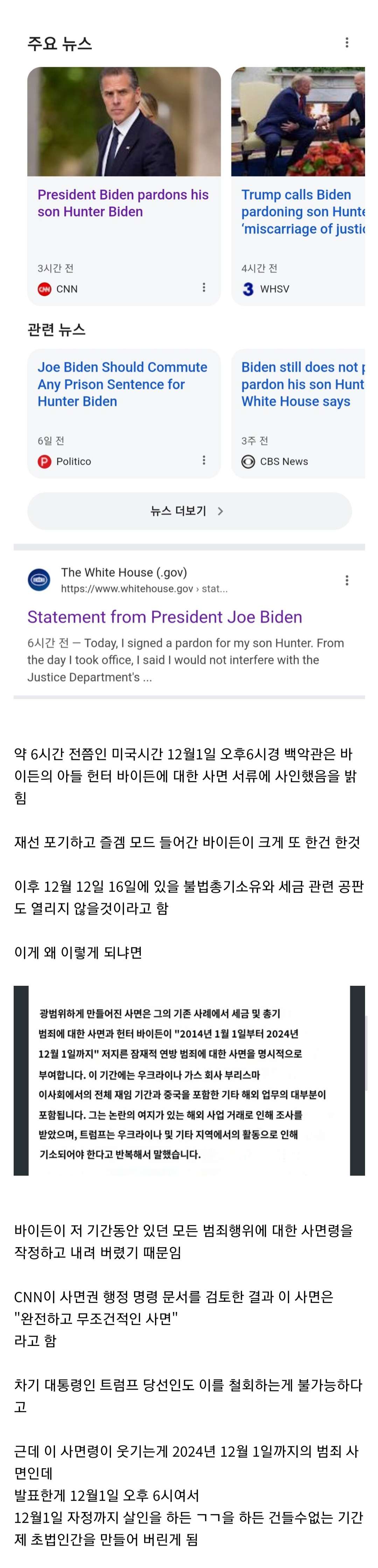 https://www.pressian.com/pages/articles/2024120217323191156 자기 아들이 저지른 모든 범죄에 대해 모조리 사면함 본문내용은 좋은 케이스지만 ㅁㅇ사범 총기탈취범 그러니까 자기 아들만 사면시키면 뭣하니까 비슷한 애들 싸그리 다 사면시켜서 비난 여론 애매하게 만들어버림 다들 알아야하는게 바이든 = 착한쪽 / 트럼프 = 나쁜쪽이 아님 근데 뉴스는 죄다 그렇게 프레임 잡고 보도하지