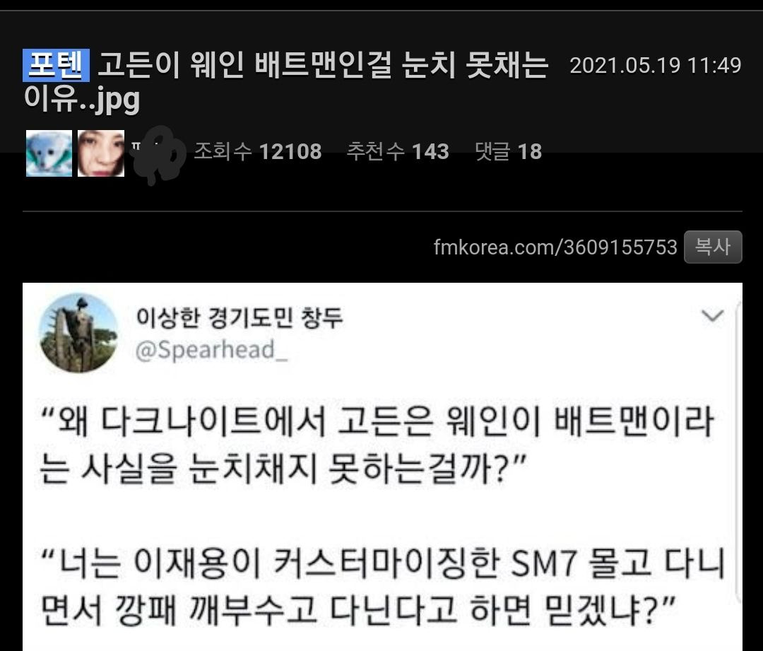 ???: 재드래곤이 한밤 중에 박쥐 코스튬을 입고 서울 시내 깡패들을 죄다 두들겨 패고 다닌다고??? | 25.01.21 00:37 | | |