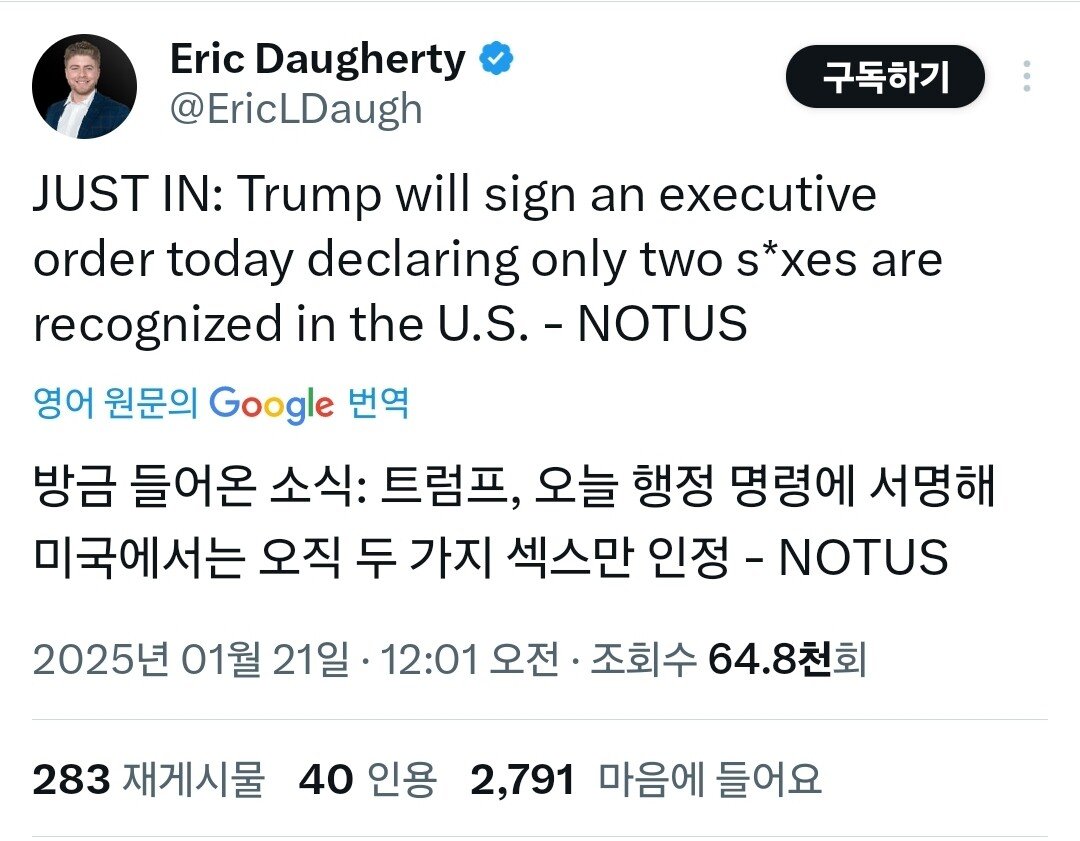 민간 영역에서는 이전처럼 알아서 하겠지만 적어도 행정부가 공식적으로 인정하는 건 남/여 둘 뿐이라고 못 박아버린 거네 ㄷㄷ...