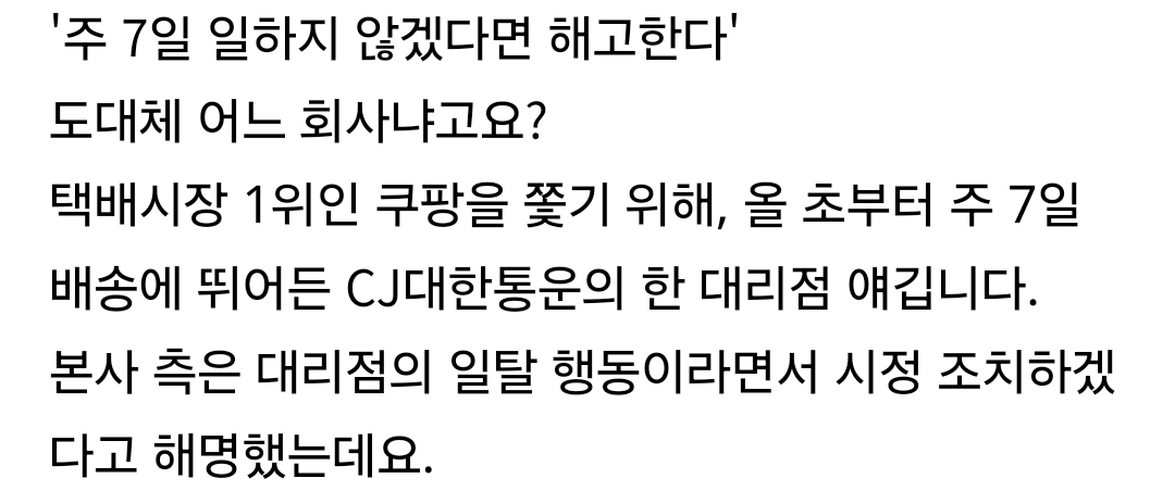 주7일 자체가 대한통운 경영방침 바뀐건데 왜 대리점을 걸고 넘어져 ㅋㅋ