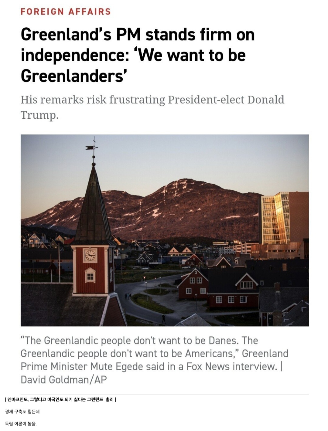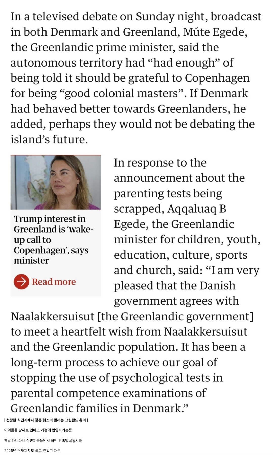 그냥 뭐 별거 없이 흔하디 흔한 원주민(이누이트 계열) 말살정책이지 놀랄 것 없잖아? 그냥 애 태어나면 강제로 덴마크 본토로 입양한다든가 과거엔 불임수술을 강제했다든가, 평소의 구미권 선진국들의 일상이었는데 방금 막 공식적으로 폐지했음 트럼프가 그린란드 가져간다니까 원주민들 여론이 그쪽으로 쏠렸거든