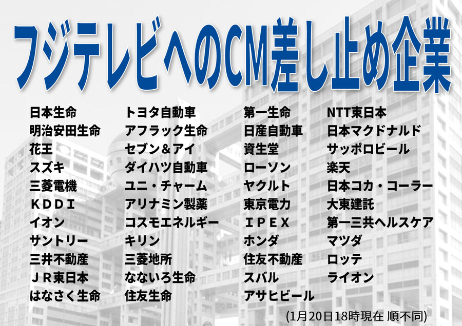 1. 유명 연예인 나카이 마사히토라는 사람이 성 상납을 받았다는게 밝혀졌는데, 후지티비가 아나운서를 시켜서 했다는게 밝혀짐 2. 후지티비 내부 폭로에 1년전부터 그 사실을 사장이 알고있었다는 내용이 있음 3. 사장이 사과 인터뷰라고 100분짜리 인터뷰를 했는데, 자신들이 지정한 기자들이 사진만 찍을 수 있게함. 거기에 " 대답해 드릴 수 없다"라는 답변만 30번 넘게하고 피해 여성한테 " 앞으로 잘 해내갈 수 있을거야. 화이팅(같은 어조)"로 인터뷰를 함 4. 이미지 곱창남 ( 원래 20년쯤 된 오래된 느낌의 프로그램 드라마 같은거만 만들어서 젊은이들이 별로 좋아하지 않았다고 함). 도요타부터해서 대기업들 광고 다 끊김 | 25.01.22 00:07 | | |