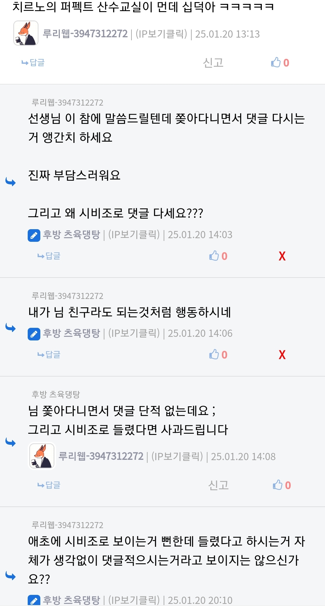 https://m.ruliweb.com/community/board/98/read/3757 이야 시비걸어놓고 자기는 아무일도 없던것처럼 나오시는거 진짜 대단하시네요 적어도 사과는 진정성있게 똑바로 하셔야죠 댓글 달고 배댓가시면 당한사람이 보기에 참 좋게 보이겠어요??? | 25.01.22 12:22 | | |