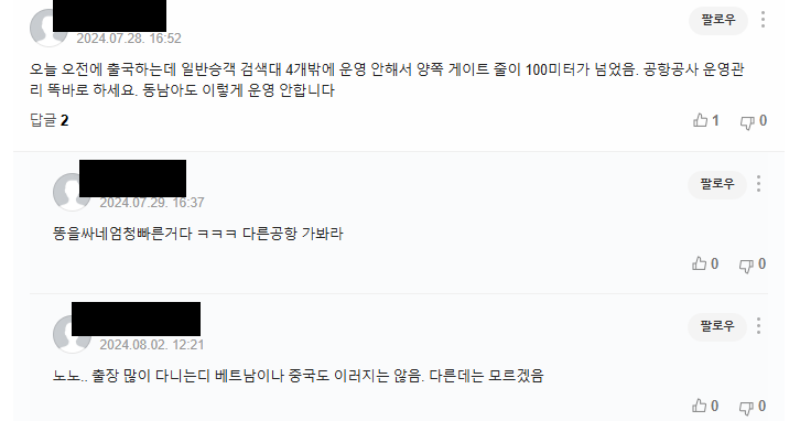 24년 여름때 기사만 봐도 2019년이랑 비슷한 수준으로 회복되었다는 뉴스 볼수 있고, 댓글보면 검색대 운영 개판이라는 댓글 종종 볼수 있음. 사람이 늘어서 일시적으로 그런거겠지 조용하다가 점점 사람들이 같은 경험 하니까 24년말 되서야 점점 목소리 커지는거임. 왜 개선안하냐고. | 25.01.23 12:55 | | |