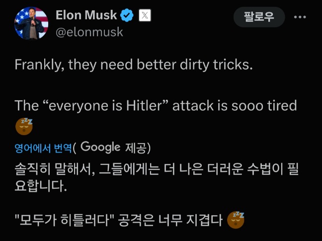 머스크 본인이 "회색영역"이라잖어~ ㅋㅋㅋㅋㅋ | 25.01.22 10:36 | | |