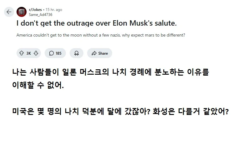 사르카즘 유머 하는 레딧 페이지라 걍 조크임 저거 ㅋㅋㅋ | 25.01.22 17:56 | | |