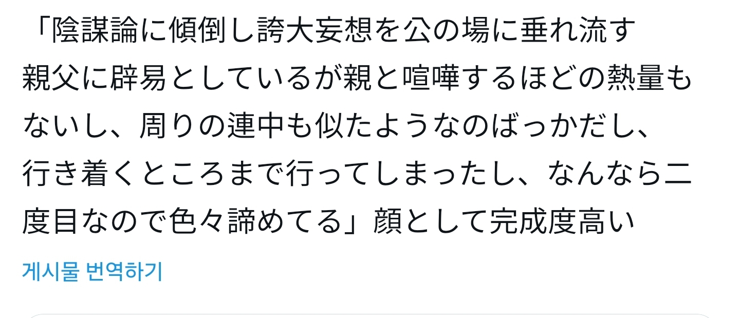 "음모론에 빠져 과대망상을 공공장소에서 질질 흘리는 아버지한테 질렸지만 부모랑 싸울만큼의 열량도 없고, 주변놈들도 비슷한 놈들뿐이고, 갈데까지 가버렸고, 아예 두번째라 이것저것 포기한" 얼굴으로서 완성도가 높은 | 25.01.24 02:22 | | |