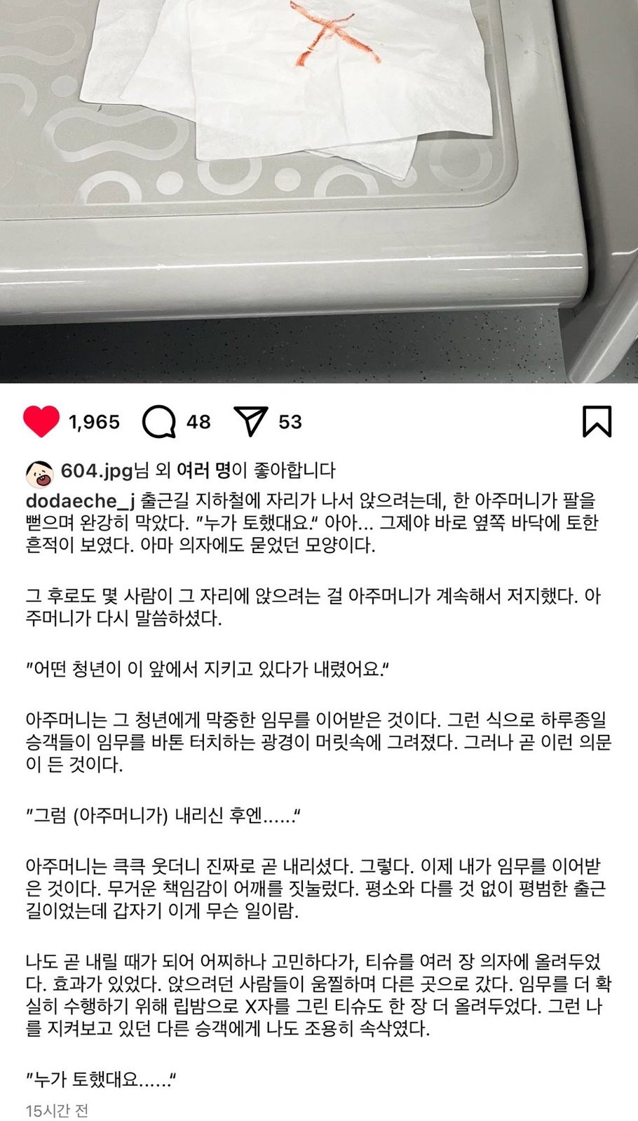 나 이거 초딩땐가 도덕책에서 본듯 지하철 좌석에 누가 토해놔서 자리 꽉 차도 그 주변 자리만 텅 비었는데 주인공 화자가 선반 위 버려진 신문지 돌돌 말아서 치우고 앉아서 다른사람들도 편하게 앉을수 있었다는것 | 25.01.24 22:34 | | |