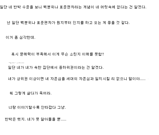 말 한마디 반박 안하고 백분위니 표준편차니 스스로도 설명못할 그럴듯한 단어를 늘어놓다가 쿨한척 하는것 보단 우위를 점하고 있다고 생각해ㅇㅇ | 25.01.26 12:18 | | |