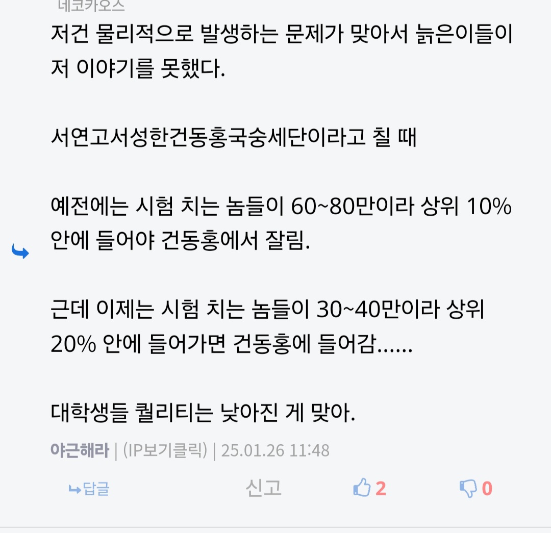 저건 물리적으로 발생하는 문제가 맞아서 늙은이들이 저 이야기를 못했다. 서연고서성한건동홍국숭세단이라고 칠 때 예전에는 시험 치는 놈들이 60~80만이라 상위 10% 안에 들어야 건동홍에서 잘림. 근데 이제는 시험 치는 놈들이 30~40만이라 상위 20% 안에 들어가면 건동홍에 들어감...... 대학생들 퀄리티는 낮아진 게 맞아. | 25.01.26 11:48 | | |