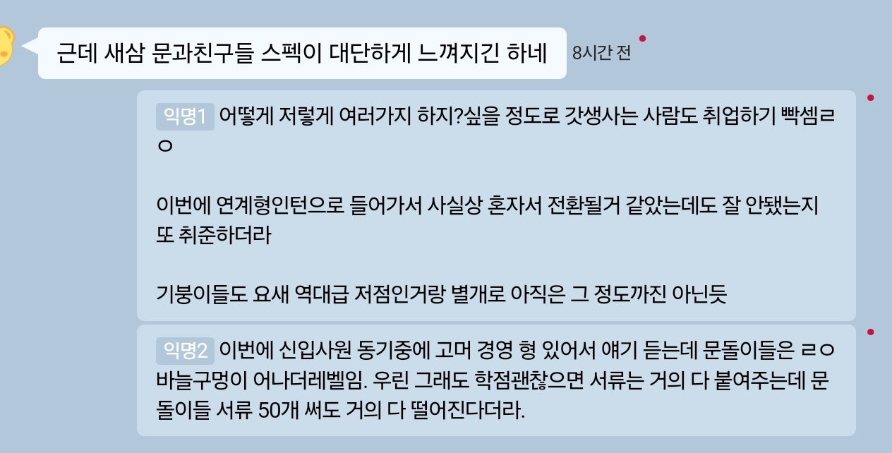 지금 국내에서 제일 잘나가는 하이닉스 인문사회 비율이 딸랑 4명이라는 사실만으로도 진짜 살기힘든게 인문계열이긴함...ㅜㅜ