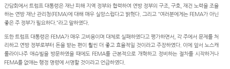 지금 이 내용인듯, 주에서 제대로 처리안하고 FEMA에 짬처리 넘기는데 FEMA도 제대로 일을안하니. 앞으로는 사고난 주에서 알아서 처리하고 나중에 연방정부에 비용청구해라 라는것같음. 판단은 알아서들 하면될듯