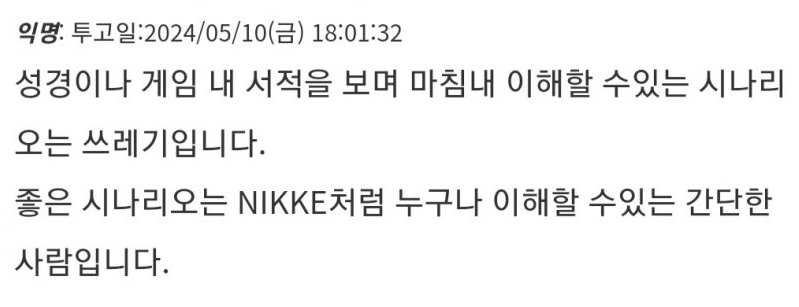 사실 "알아들을 수 없는 얘기만 늘어놓는다"는 보통 중국 게임들 특징임. 일본에서도 그거 관련해서 중국겜 까는 얘기 나오고. 니케 스토리가 호평을 받은 것도 그 동안 불친절한 중국겜 스토리과 대조적으로 되게 직관적이라는게 아주 크다더라.