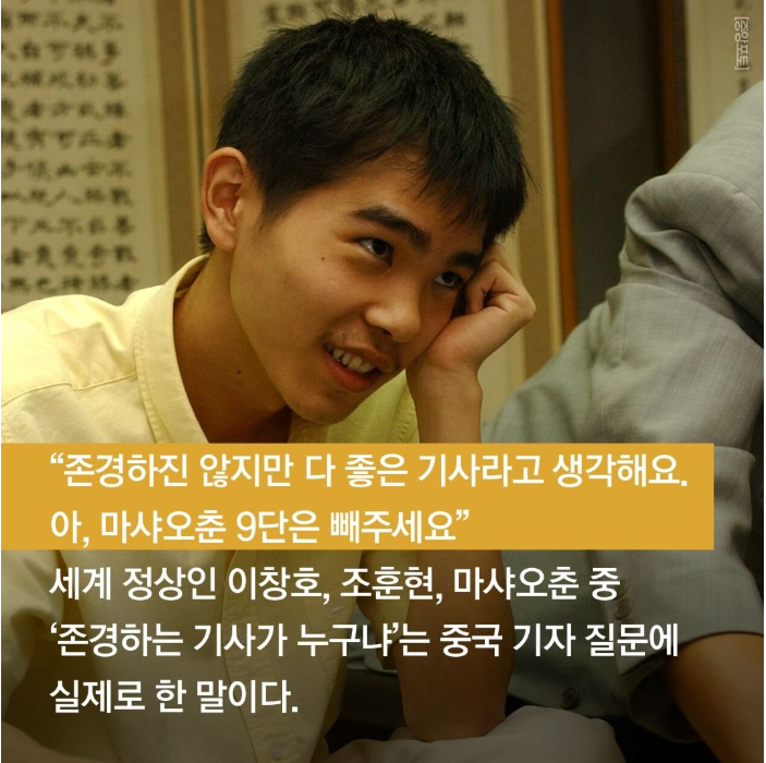 아참, 댓글이 좀 오해의 소지가 있는데, 이창호가 마샤오춘보다 11살 어림. 사석에선 정말 친했고, 마샤오춘이 은퇴하기로 하자 이창호 9단은 자기 때문에 마샤오춘이 은퇴하는가 싶어서 굉장히 괴로워하셨다고 | 25.01.28 11:42 | | |