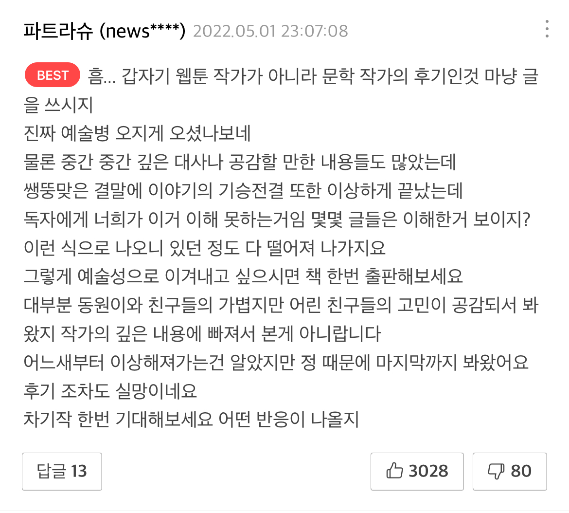 그러고 이럴때마다 결말이 개 ↗같은데 명작 어쩌구 하는 개소리를 들고 나오는 사람들이 있는데 정작 그 소리를 지껄인 만화가의 모델이나 만화내의 사람은 후지타와 시마모토보다 안팔리는 만화가의 소리란걸 알아야함 | 25.01.29 10:59 | | |
