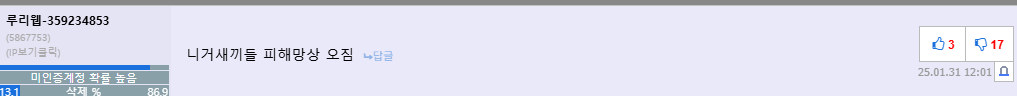 https://bbs.ruliweb.com/community/board/300143/read/69367217#ct_361408936 니거가 어쩌고 댓글 달았다가 욕먹으니까 삭제 빤쓰런 ㅋㅋㅋ ㅋㅋㅋㅋㅋㅋㅋㅋㅋㅋㅋㅋㅋㅋ | 25.01.31 12:17 | | |