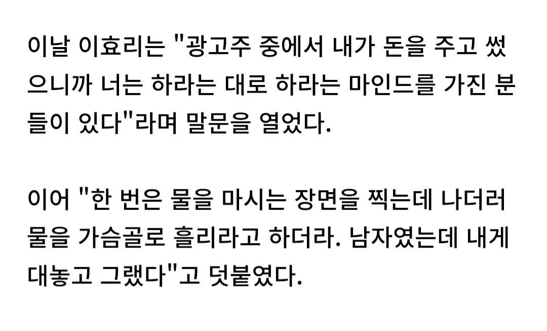 쉽게 말하자면 배우로써 이건 왜 이렇게찍어요? 라고 회의하거나 이것저것 조율하고싶은데 광고는 딱히 그래야할이유가없고 기존콘티조차도 위에서 급작스러운 변덕으로 변경되면 그냥 찍어야해서 불만이라는거구먼. 약속 운운하길래 회사자체의 신용도문제인가 싶었는데 이런쪽이면..약속이랑은 상관없잖아 굳이따지자면 배우도 감독의 의중에따라 연기하는걸 약속하고 고용하는건데 그걸 콘티떄마다 이거 왜이럼? 이걸로 봐꾸져? 딴지걸면 그것도 일종의 약속어기는거지 ㅋㅋㅋ