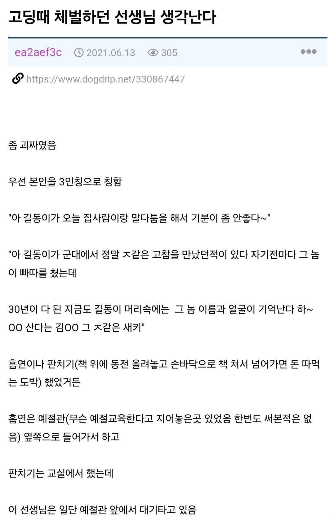 나 중학교 다닐때는 정장용이라는 선생 있었음 왜 이름 기억하냐면 첫 수업시간에 장정용이 아니라 정장용이라면서 아재개그 한 5분정도 자기소개 했는데 존나 재미없어서 이름이 기억남. 그때 애들 표정이 한 10년뒤에 월급주는 사장 개그 할때 표정같았음. 그리고 왜 그사람을 지금까지 기억하냐면... 어느순간부터 학교를 안 나왔는데 알고보니 공립중학교에서 술먹고 수업하다 짤림. 내가 초중고교 다니면서 온갖 기괴한 선생들을 다 봤지만 이양반이 내 도덕관념에선 최하위권이라 잊을 수가 없네