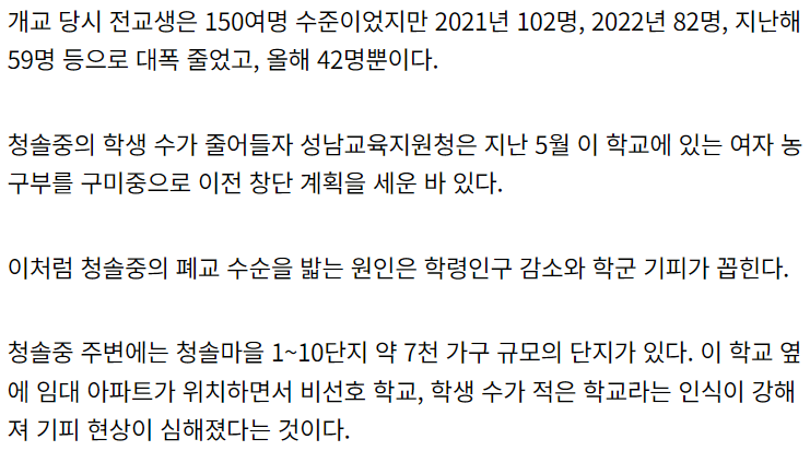 단순 학생이없기보단 그냥 비선호군인게 가장 큰 문제더라. 근처에 다른 중,고등학교도많은데 저 학교 위치가 산업단지인데다가 진짜 문제아 들만 많이가는 학교가 되어버려서 기피학교가 되어버렸다고...