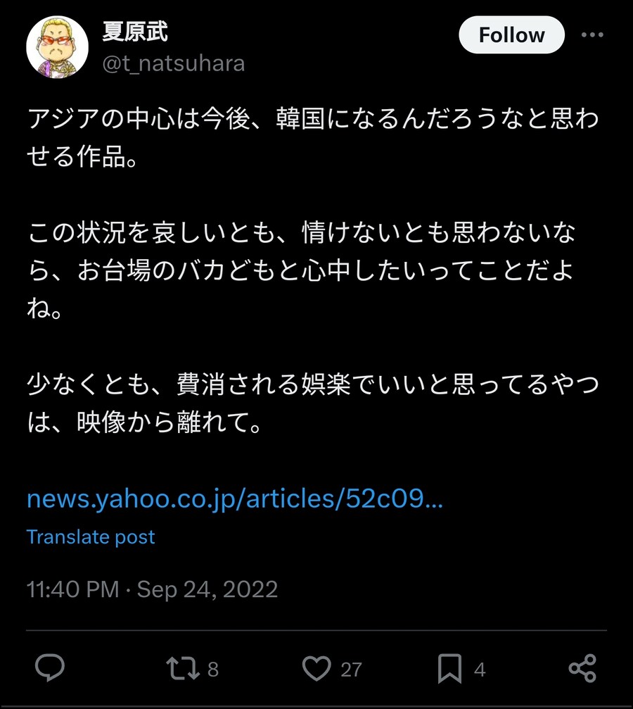 日 유명배우, “영화는 한국이 위…대학생과 유치원생 차이” 비판 https://mydaily.co.kr/page/view/2014022513322301122 | 25.01.31 23:21 | | |