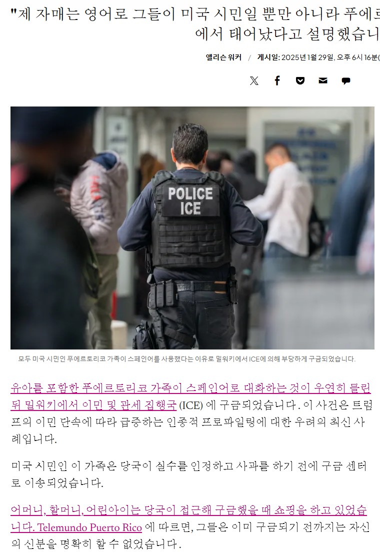이민단속국 영어 말고 다른나라 말(=스페인어) 썼다고 체포 | 25.02.03 07:53 | | |