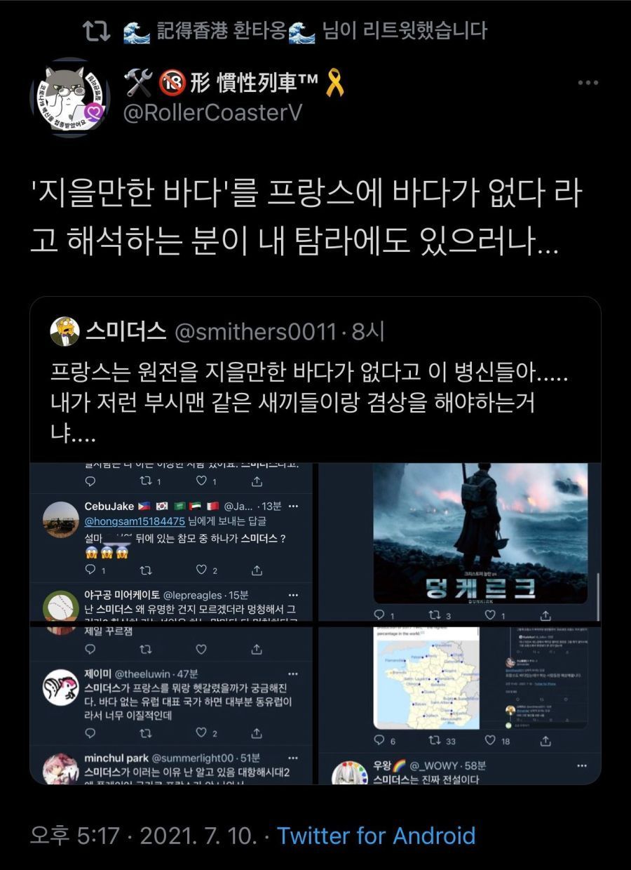 저 스미더스는 지가 개떡같이 써놓고 ㅈㄹ은. 심지어 윗 대댓글처럼 원전지을 바다가 없다는 뜻이라고 양보해도 프랑스는 이미 원자력 발전소 18개를 돌리고 있고 원자로도 유럽에서 가장 많이 보유한 나라니 완전히 틀린 말이고. 백번 양보해서 '더 이상' 원전 지을 바다가 없다는 뜻이었다고 해도. 당장 올 1월에 프랑스에서 새 원자로 6개니 14개니 하면서 추가로 지을 계획 세운다고 하니 또 틀린 말임. | 25.02.03 08:38 | | |