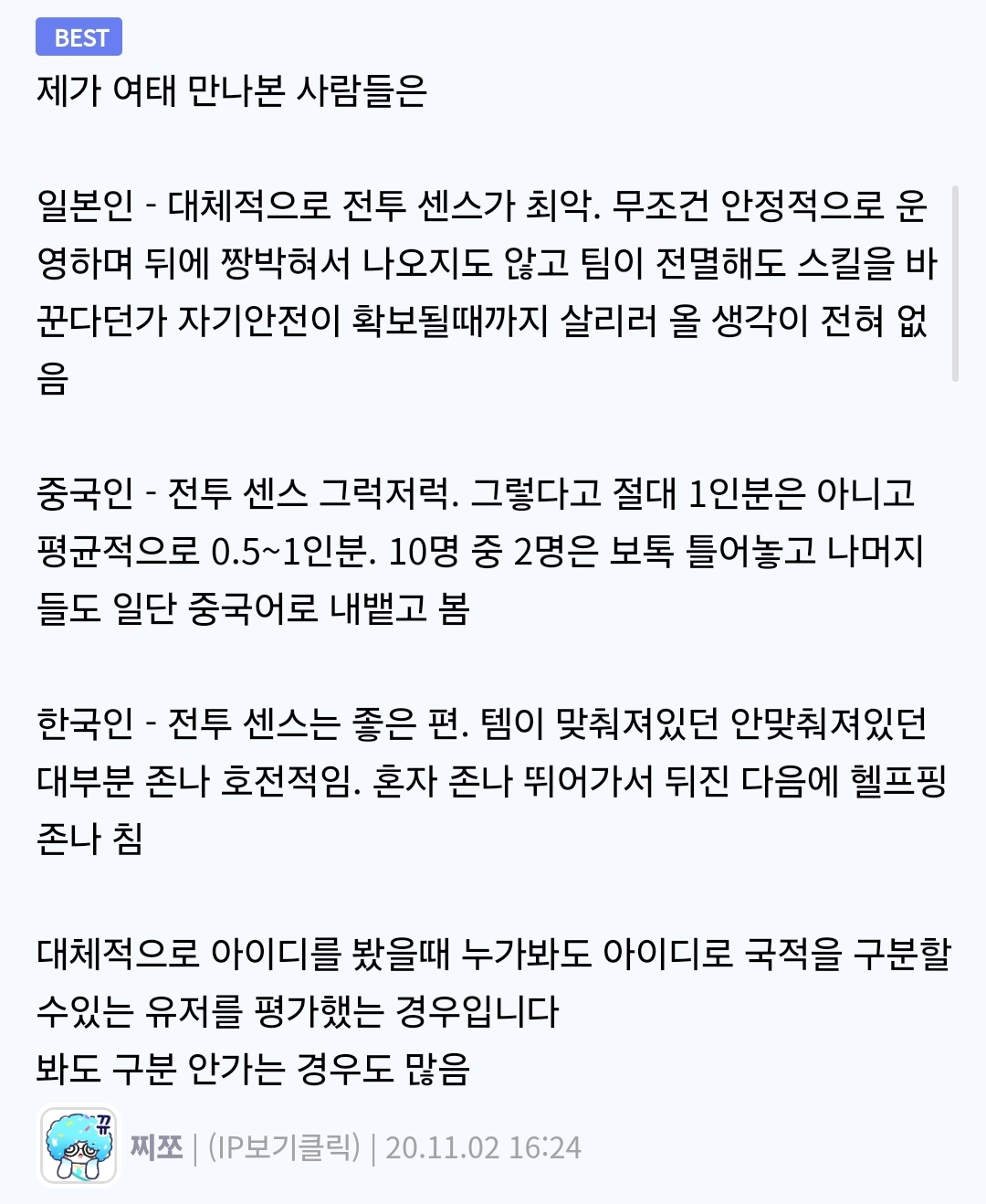 진짜 한국인만 있는 썩은어택같은걸 해보면 아니긴함.. 에펙 일섭하면 맨날 아군 죽어도 숨어있는게 대부분이었음.. | 25.02.03 11:49 | | |