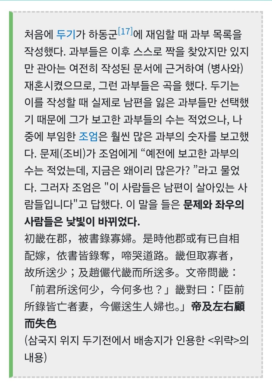 아래 한자 보면 두기가 답한걸 조엄이 답한걸로 오역한듯. "두기가 답하기를 '신이 조사한 명단은 모두 남편을 잃은 과부들이지만, 지금 (조)엄은 살아있는 사람의 부인들을 보내고 있습니다.'라 하였다." 라고 번역하는 게 좀더 나았을텐데. | 25.02.03 11:54 | | |