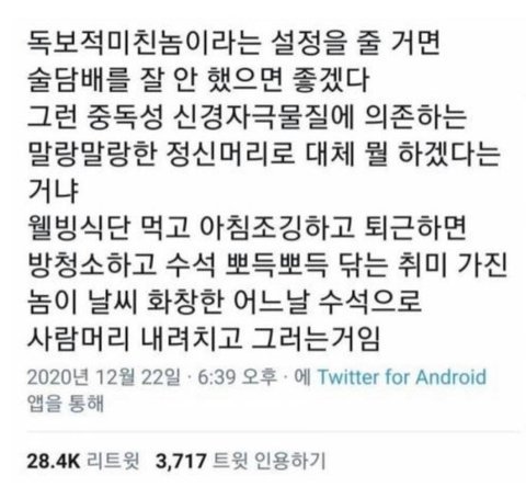 술담배를 안한다 => 그래도 건강한 생활을 한다는 거겠지 => 건강한 몸에 건강한 정신이 깃든다는 말도 있는데 = 그런데 하는 소리들이? | 25.02.03 13:00 | | |