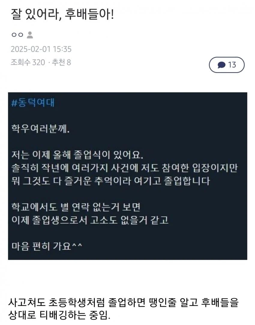 되려 졸업했으니 더 거릴낄게 없는거 아닌가? ㅋㅋㅋㅋ | 25.02.03 15:24 | | |