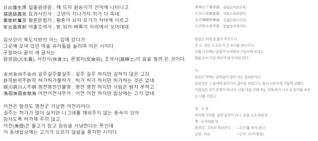 저게 주작이라 해도 저거 말고도 김삿갓은 발음 이용한 말장난시나 섹드립시가 많고 유명한 사람이라 믿겨지긴 하네 ㅋㅋㅋ