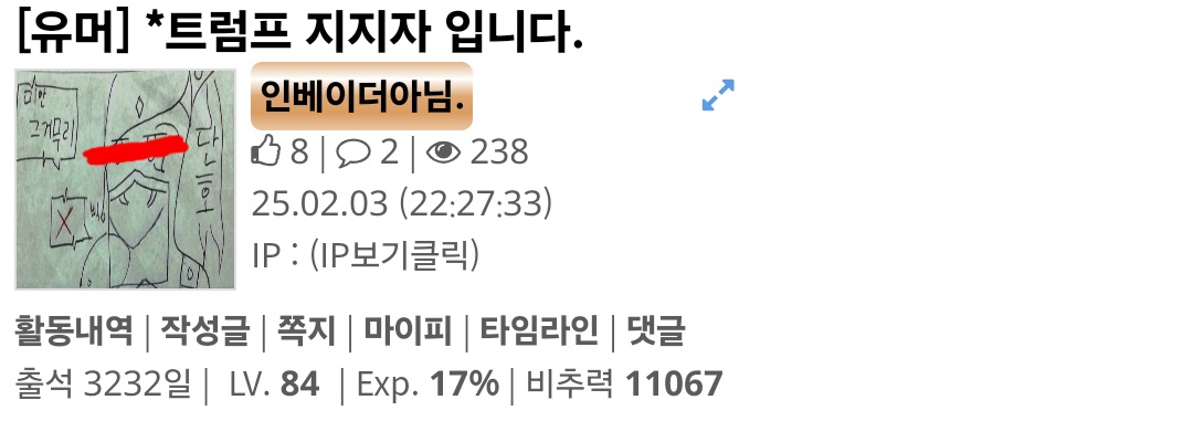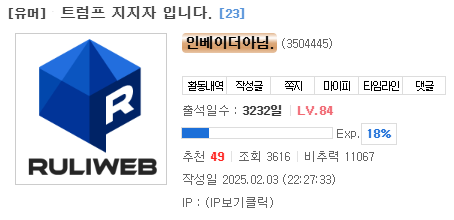 관세로 밑에 놈들 뒤지든 말든 그 틈바구니에서 어떻게 해서든 쪽 빨아먹고 튈 생각하는 십새기들과 빨대 꽂힌줄도 모르고 신나하는 ㅂㅅ새기들의 합작 ㅋㅋㅋㅋ | 25.02.03 22:32 | | |