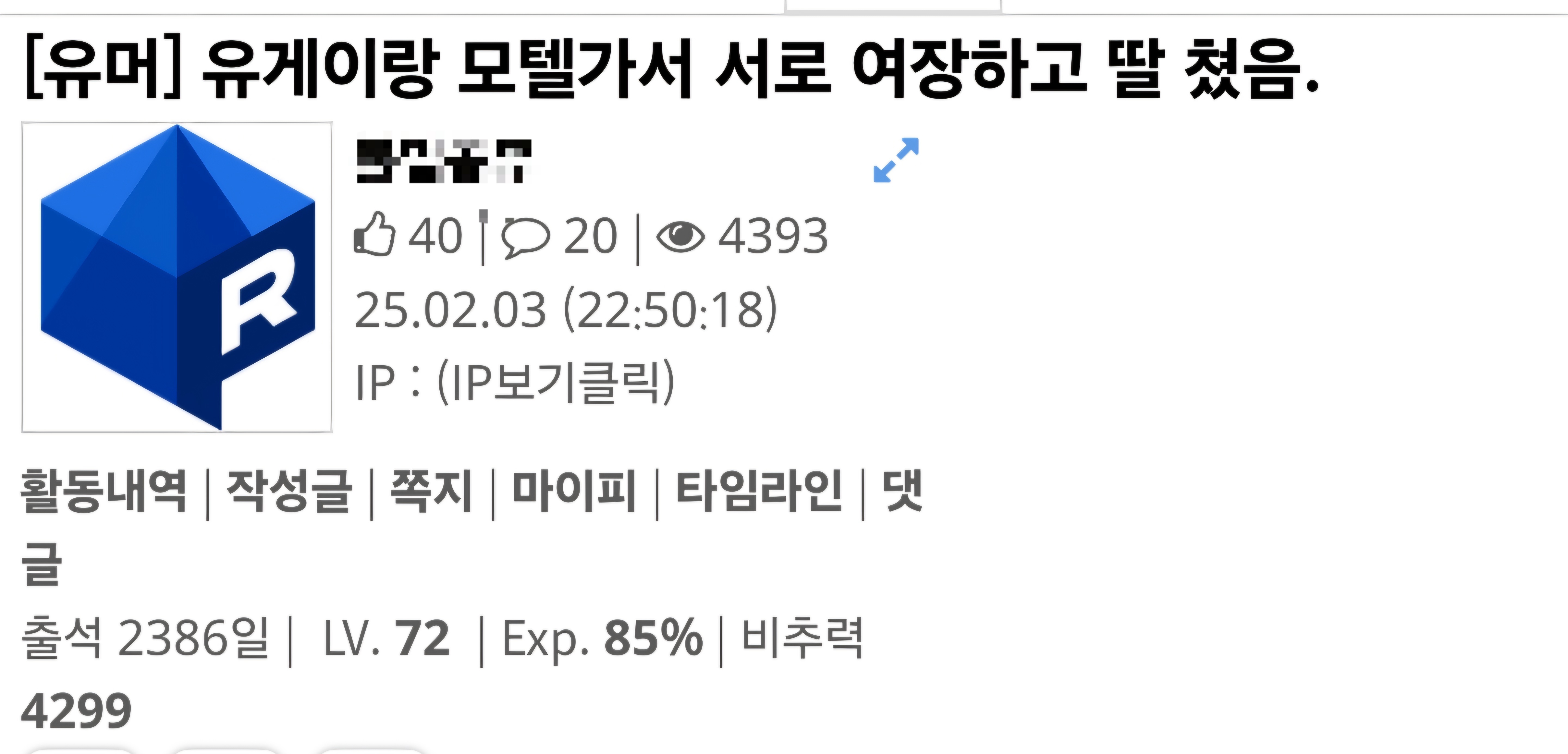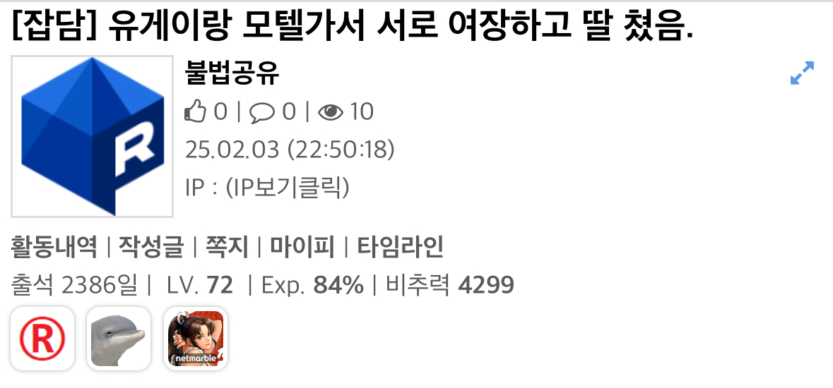 과거 유게에서 있었던 ㅈ목질 사태 그 얘기인가 해서 들어와봤지 카톡 따로 파서 졷목도 하고 여장벌 중심으로도 졷목하고 금전관계에 애정관계에 장난 아녔다던데