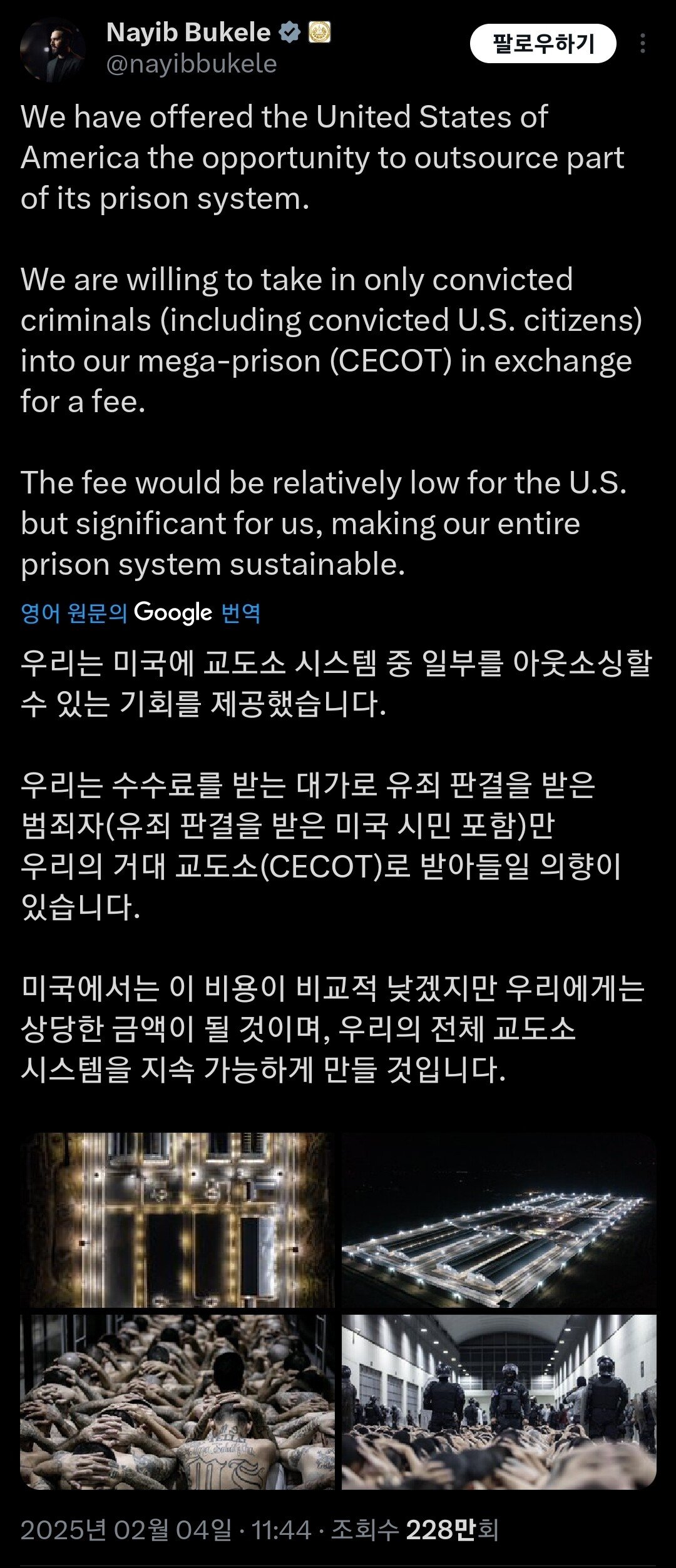 놀랍게도 이미 그러고 있음 하지만 ㅁㅇ갱 척살 다섯글자에 환호하며 엘살바도르 정상화는 부켈레 소리 계속 나오는 중 | 25.02.04 14:38 | | |