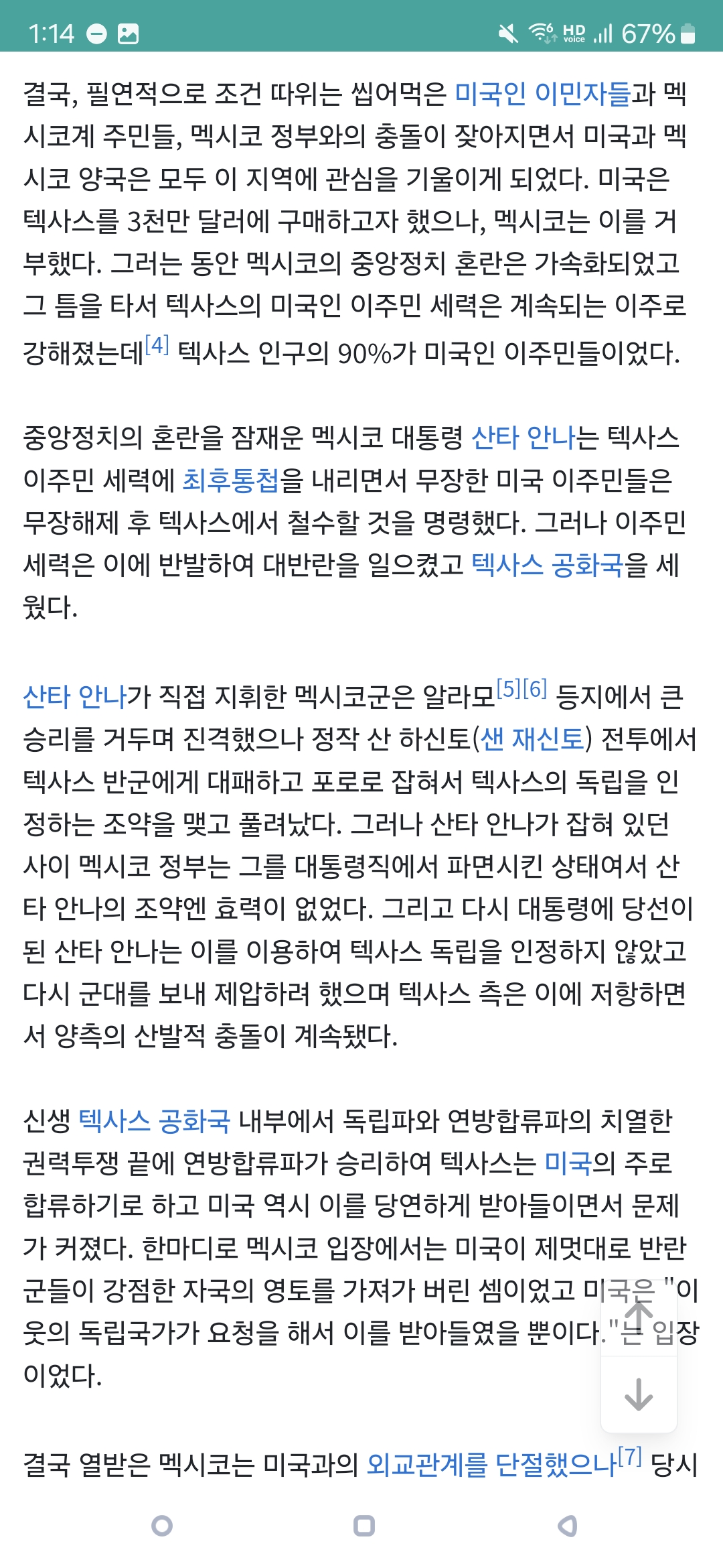 - 멕시코가 독립해서 정신 없으니 미국인 불체자 보내서 땅에 알박고 클레임 주장하다가 미-멕 전쟁으로 텍사스 뺏어감. 다 알다시피 텍사스엔 기름이 남. 그 외 캘리포니아/네바다/유타/뉴멕시코까지 뜯어간 건 덤. | 25.02.05 01:16 | | |