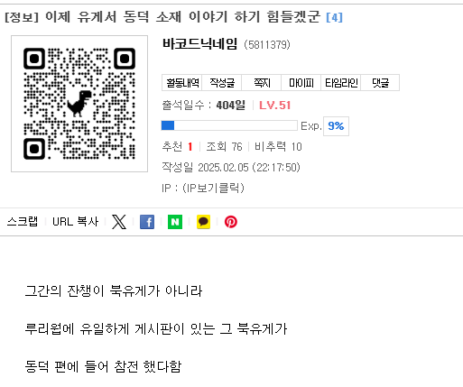 쟤가 북유게나 사정게 등등 정치게시판에 글안쓰고 남유게에만 페미정치 혐오물타기 하는애임 | 25.02.05 22:38 | | |
