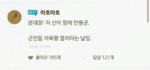 포반장(중사) : 야 저 산 졸라 마음에 안 들지 않냐? 계산병(상병) : 저 산이 마음에 안 드시면 집에 가셔야지 말임다 | 25.02.06 13:51 | | |