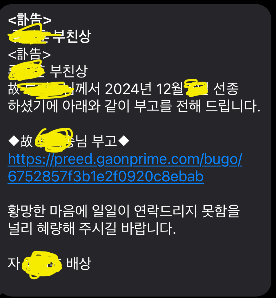 보통 부고문자는 이렇게 대부분 상주 명의로 오니까 참고하시길.