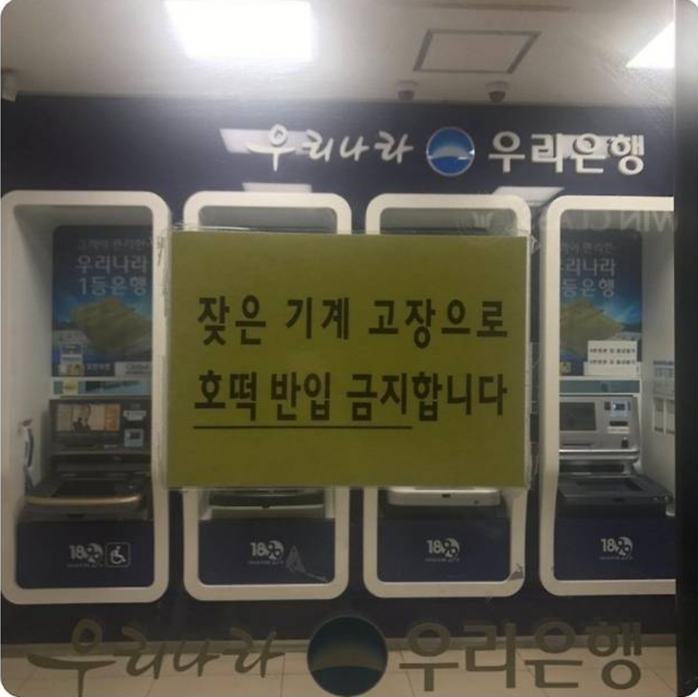 내 기억으로는 저 은행 앞에 호떡 맛집이 있던 걸로 기억함. 그래서 호떡 사먹던 손님들이 그거 들고 그대로 은행 들어가 일 보다 기름긴지, 설탕인지가 기계 안에 스며들어 자주 고장을 일으켰다나? 저거 예전에 뉴스에도 나왔었음