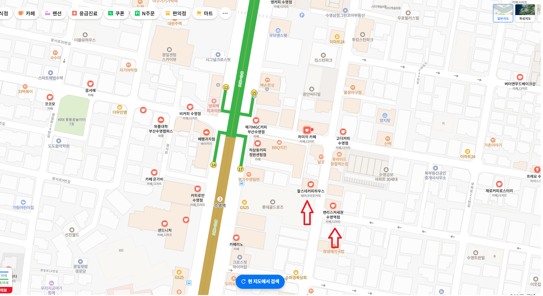 지도 찾아 봤는데, 살아남기 힘든 동네네. 메가커피와 하삼동커피가 수문장처럼 자리 잡고 있고, 그 외에도 카페가...