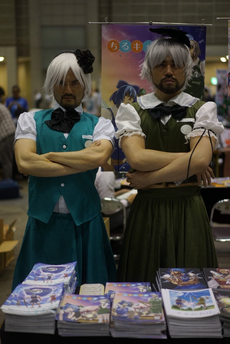 "우리 서클 부스에 잘 왔다." "잘 왔다." "이 동인지를 사려면 우리를 이겨야 한다." "이겨야 한다."