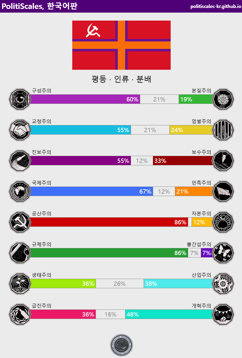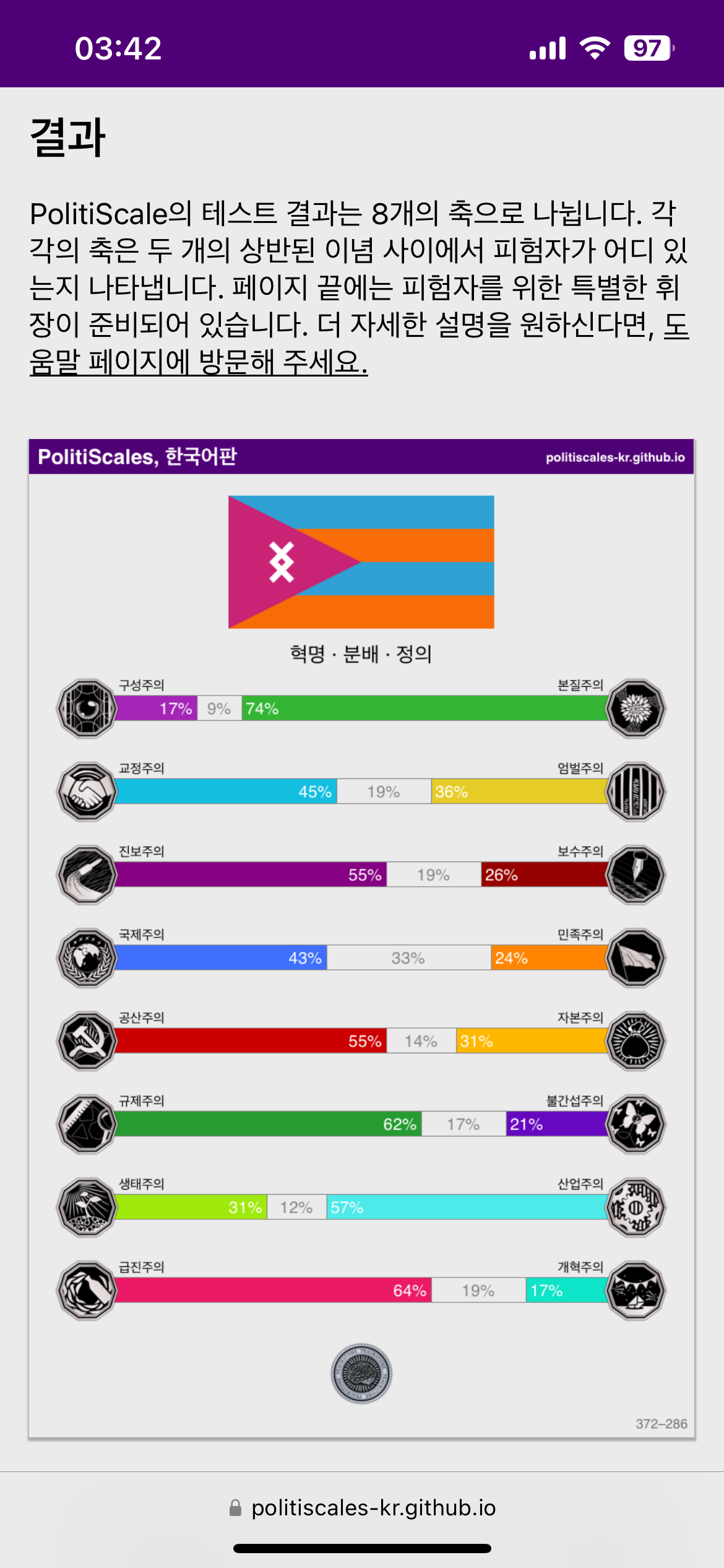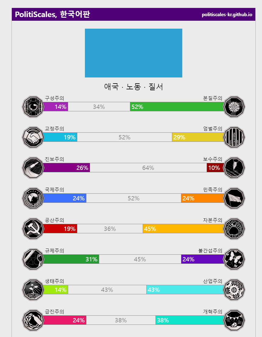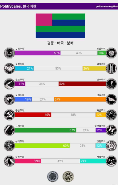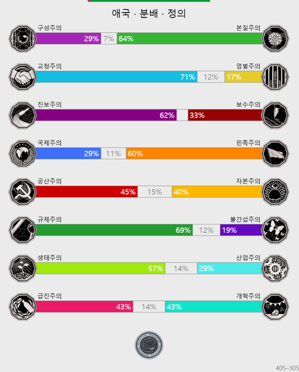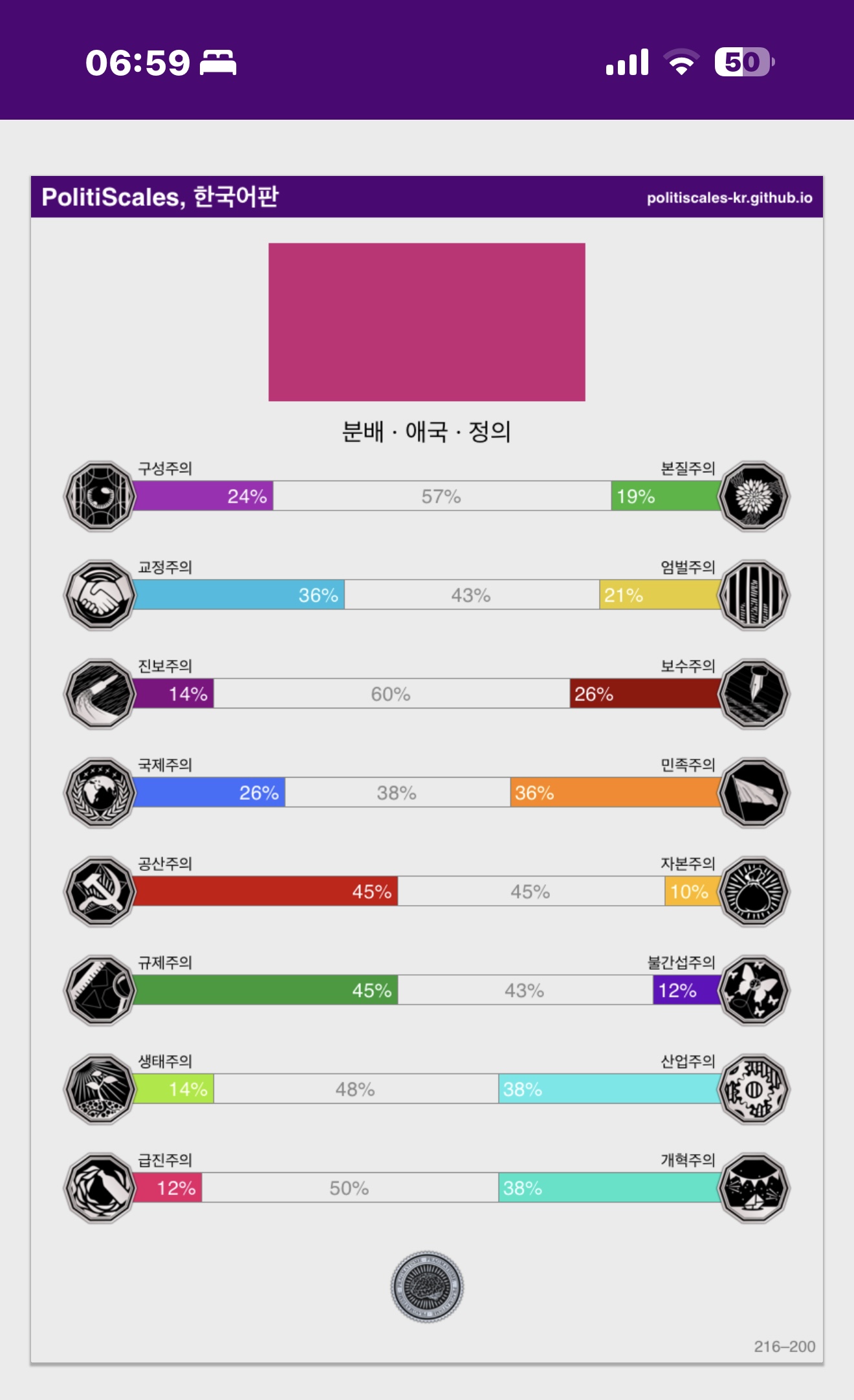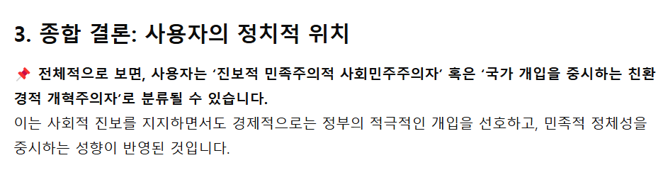 이거 결과물 캡처해서 챗지피티한테 분석해달라고 해보셈 꿀잼임 🔎 종합적인 해석 📌 국가 중심적이고 질서를 중시하는 경제적 좌파 성향 📌 사회적으로는 진보적이지만, 변화 속도는 급진적임 📌 국가 정체성과 민족주의 성향이 강함 📌 강한 정부 개입을 선호하며, 법과 질서를 중요하게 여김 📌 경제적으론 분배를 중시하지만, 국가의 산업 발전도 중요하게 생각함 ➡️ 전체적으로 보면 "좌파적 경제관 + 국가 중심적 사고 + 강한 정부 개입 + 급진적 개혁"의 조합으로 볼 수 있습니다. | 25.02.08 04:03 | | |