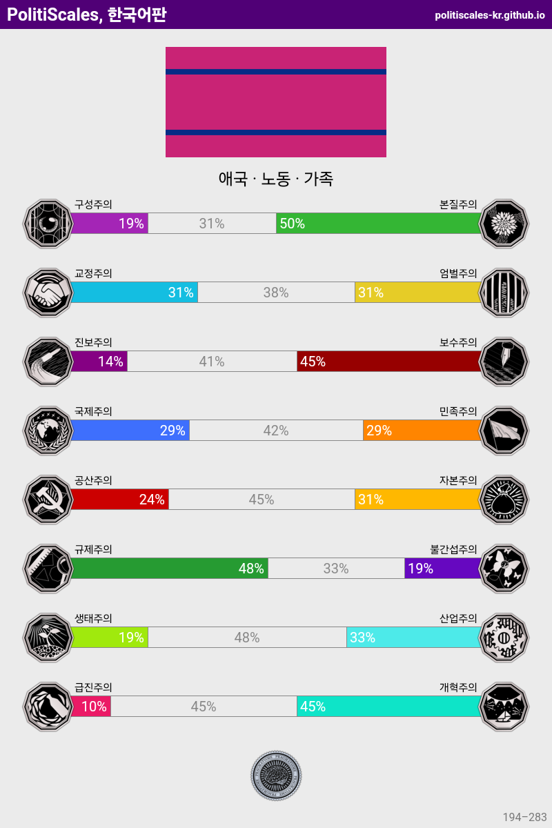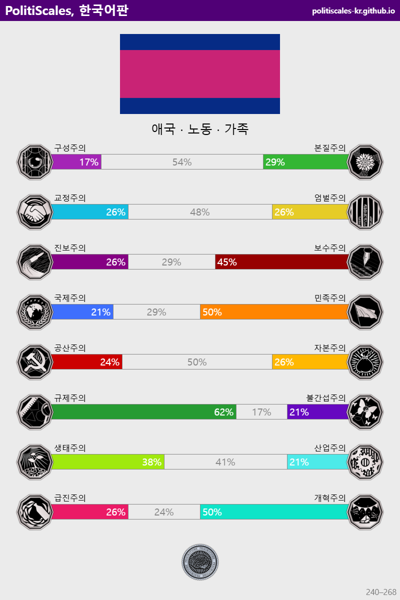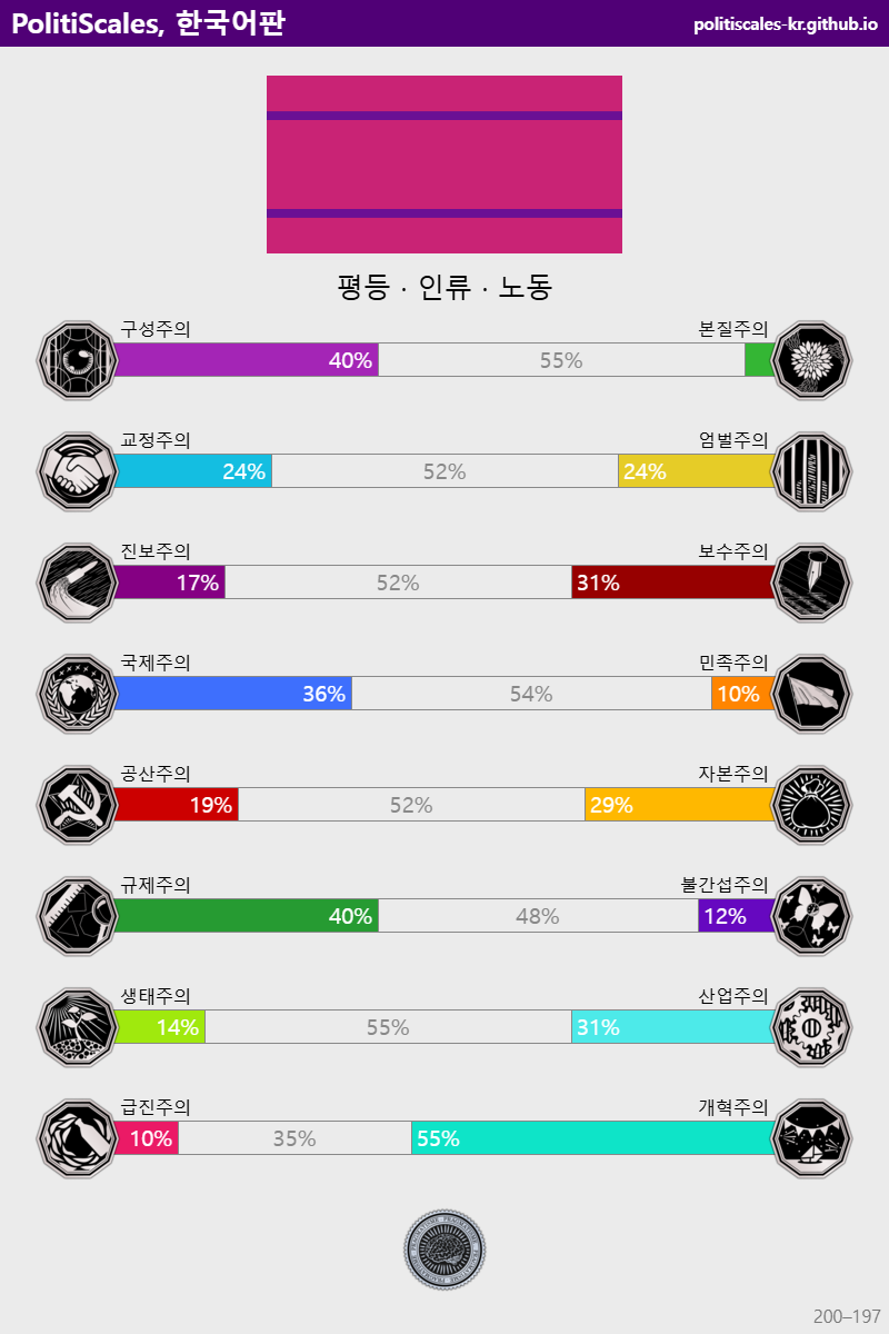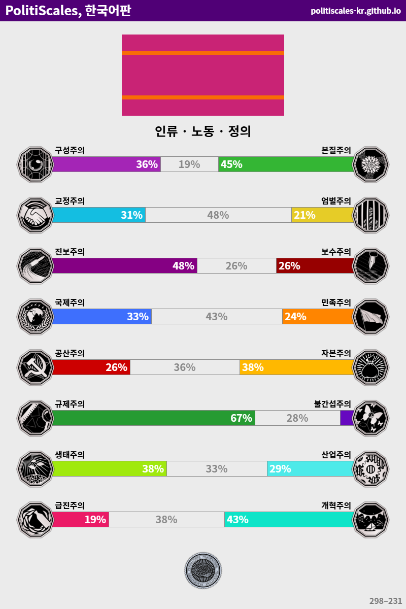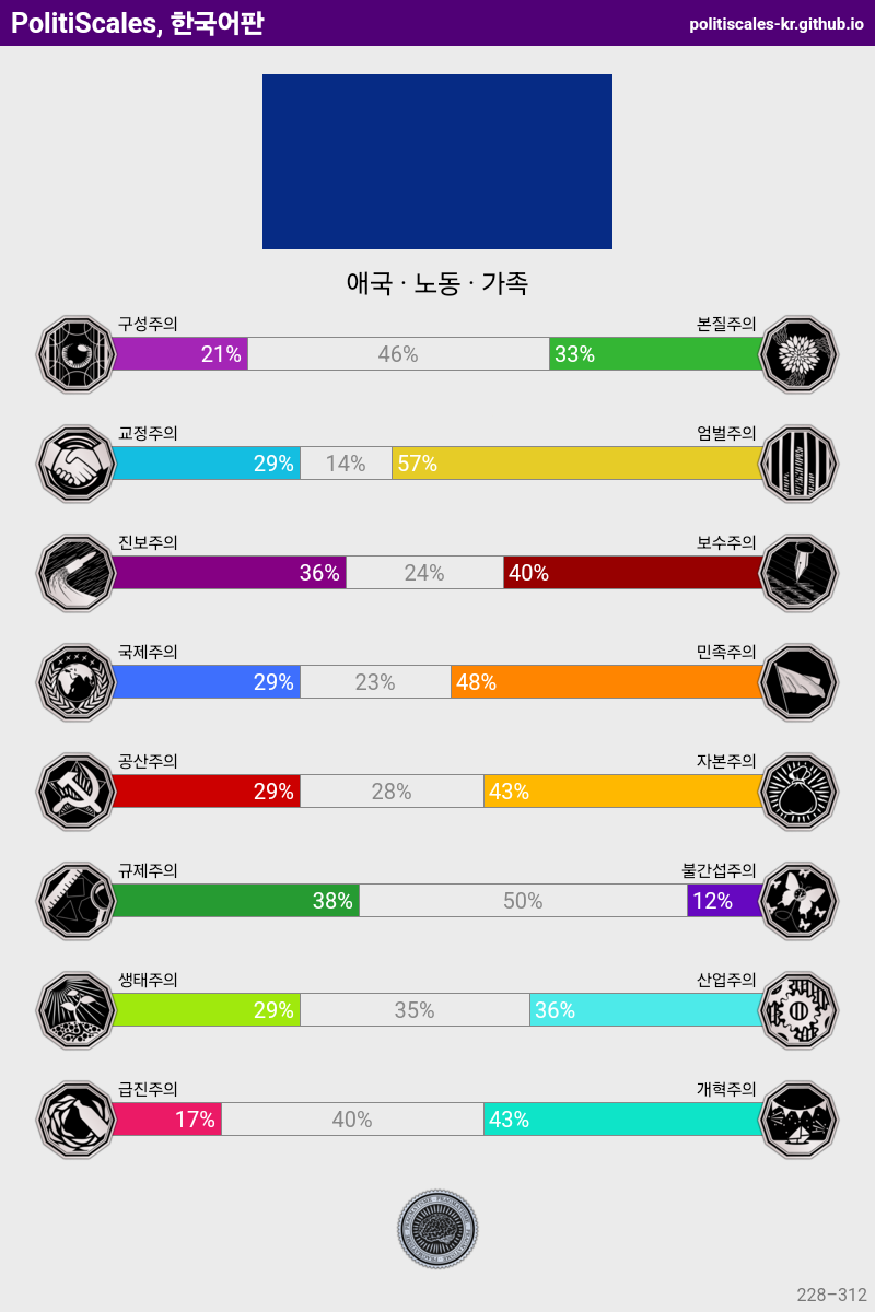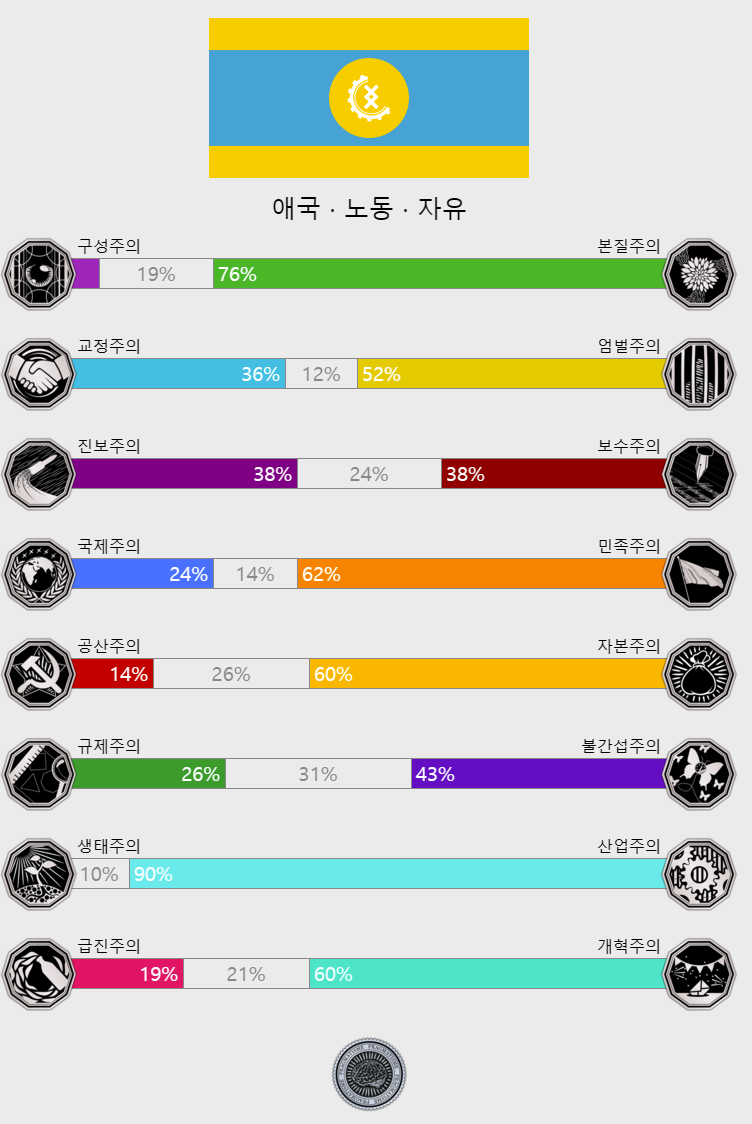 이거 결과물 캡처해서 챗지피티한테 분석해달라고 해보셈 꿀잼임 🔎 종합적인 해석 📌 국가 중심적이고 질서를 중시하는 경제적 좌파 성향 📌 사회적으로는 진보적이지만, 변화 속도는 급진적임 📌 국가 정체성과 민족주의 성향이 강함 📌 강한 정부 개입을 선호하며, 법과 질서를 중요하게 여김 📌 경제적으론 분배를 중시하지만, 국가의 산업 발전도 중요하게 생각함 ➡️ 전체적으로 보면 "좌파적 경제관 + 국가 중심적 사고 + 강한 정부 개입 + 급진적 개혁"의 조합으로 볼 수 있습니다. | 25.02.08 04:03 | | |