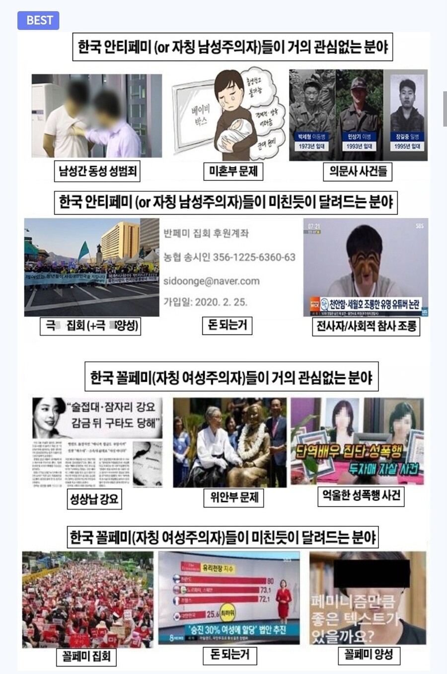 요즘 안티페미 남성인권 이러는 애들 대부분이 아니고 그냥 100% 죄다 저런 성향인 거 같아서 존나 씁쓸함, 여초 등쳐먹는 페미랑 다를 바가 없음