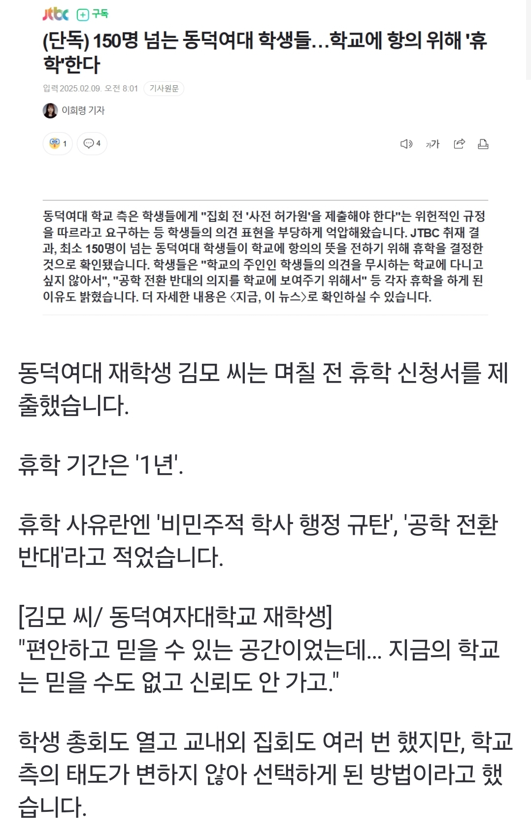의대생 집단휴학 같은 건 시위행위로 성립했으니까 방식 자체가 이상하다고 볼 정돈 아닌 거 같은데 7000명 중 150명이면 그냥 평상시보다 휴학생 비중이 살짝 오른 정도라... | 25.02.09 11:11 | | |