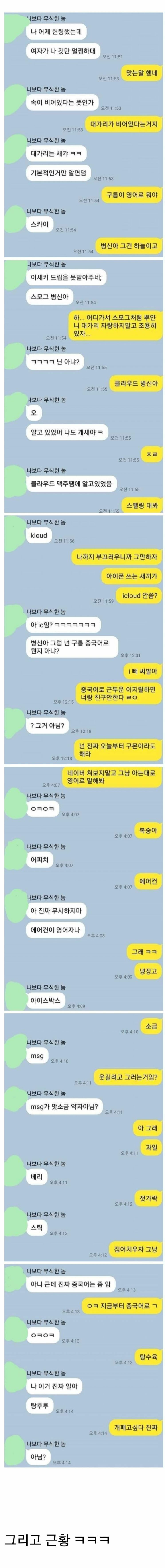 저거 예전에 돌던 카톡 캡처인데, 자기 빡대가리지만 착한 친구 놀리는 거 였음. 아마 유게이 였던걸로 꽤나 여러 시리즈가 있었음 | 25.02.09 22:21 | | |