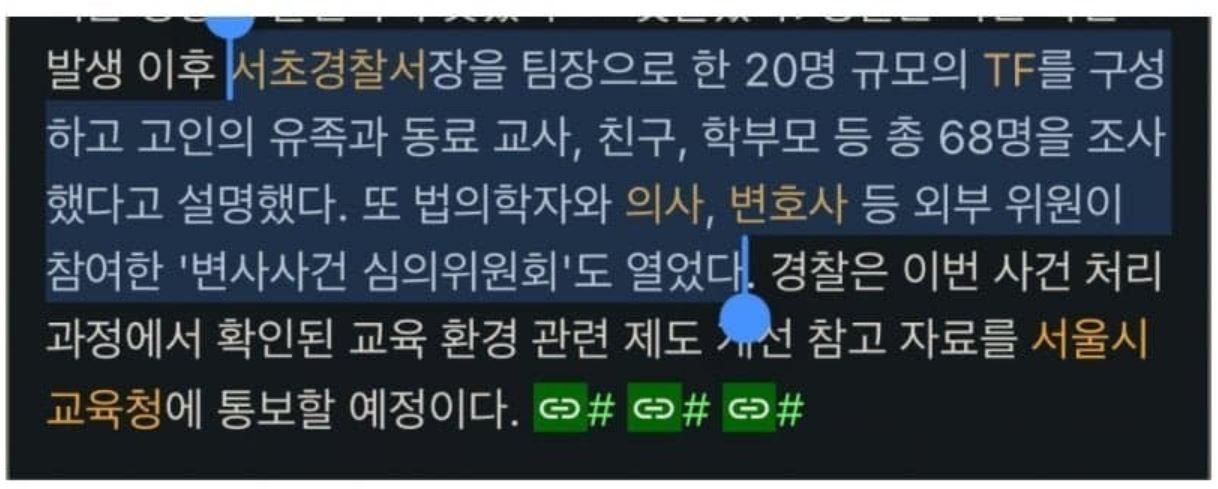 제발 최신 기사를 보세요 좀 https://news.zum.com/articles/89025734?cm=news_rankingNews 고인의 사촌오빠인 박두용씨는 “이 영상이 외부에 알려지면 고인이 사랑했던 반 아이들이 직간접적 피해를 볼 수 있다고 생각했다”고 그간 침묵했던 이유를 밝혔다. 유족의 법률 대리인인 문유진 변호사는 “같은 학교 동료 교사가 주고받은 하이톡 대화는 1년 동안 300건 미만인데 서이초 교사는 2023년 1학기 90일 동안 약 2000건의 대화를 했다”면서 “종일 과중한 부담에서 벗어나지 못했던 서이초 교사의 죽음에 사회가 책임을 져야 한다”고 말했다. | 25.02.11 16:51 | | |